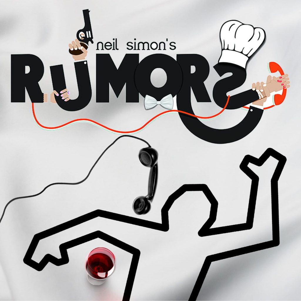 RUMORS is considered the funniest farce written by Neil Simon. A celebrity couple have invited their friends to celebrate their 10th wedding anniversary, but as guests arrive they discover that the husband has shot himself through the ear, the wife is missing, and the servants have left without preparing dinner. To protect the hosts from rumor mills, the friends attempt to cover up the whole episode – from the outside world and from each other – setting off a spiraling web of secrets, lies and misunderstandings, and a crazy night of classic slamming-door farcical hilarity.